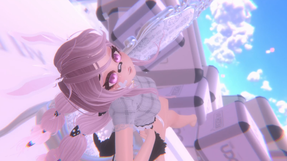 Head -Starlynn#8980, Body -Onion#1515, Romper/Bows/Hat/Rainboots -Zioketski, Garter -Yamu#0195, Long Hair -Vaccine, Braids/Bunny Ears/Bunny Tail/Choker -bunisu#4924, Panties -Cupkake#6666, Bandaids -Cimomo#2611, Gun -KasaiAisu#8268, Skirt -Milky Mommy#6969, Locomotion/Hair Texture -Wetcat#6969, Socks -Wen#4076